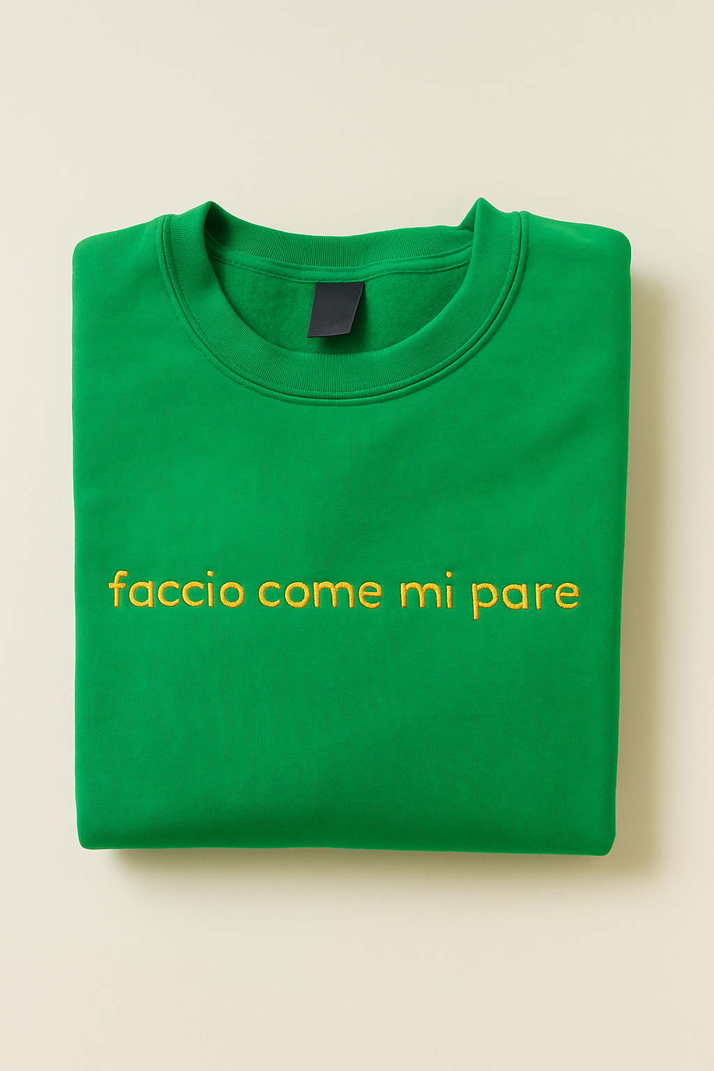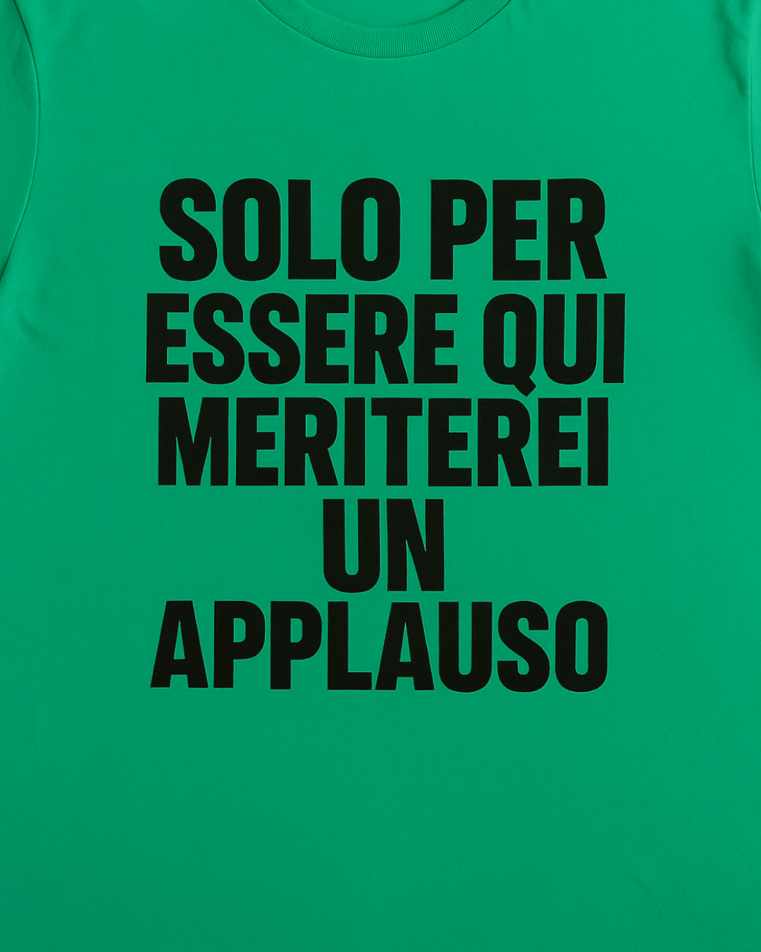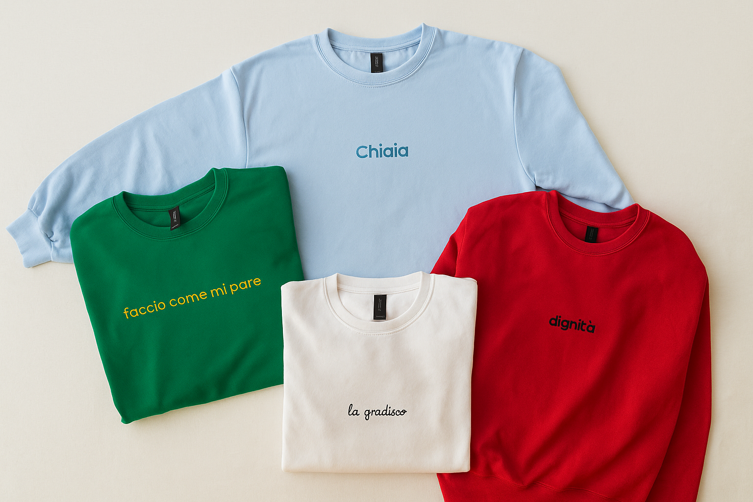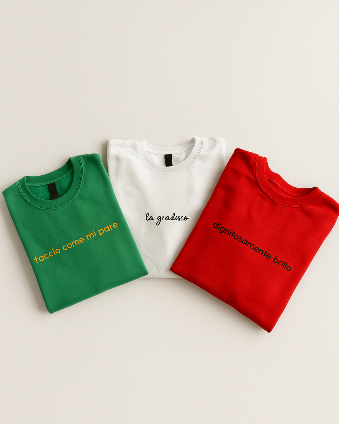 L’AI ci permette di raccontare il mood del brand in modo ironico e visivo, ma i prodotti che vedi sono reali: t-shirt e felpe stampate o ricamate, che puoi toccare con mano e pronte a comunicare un lato di te.